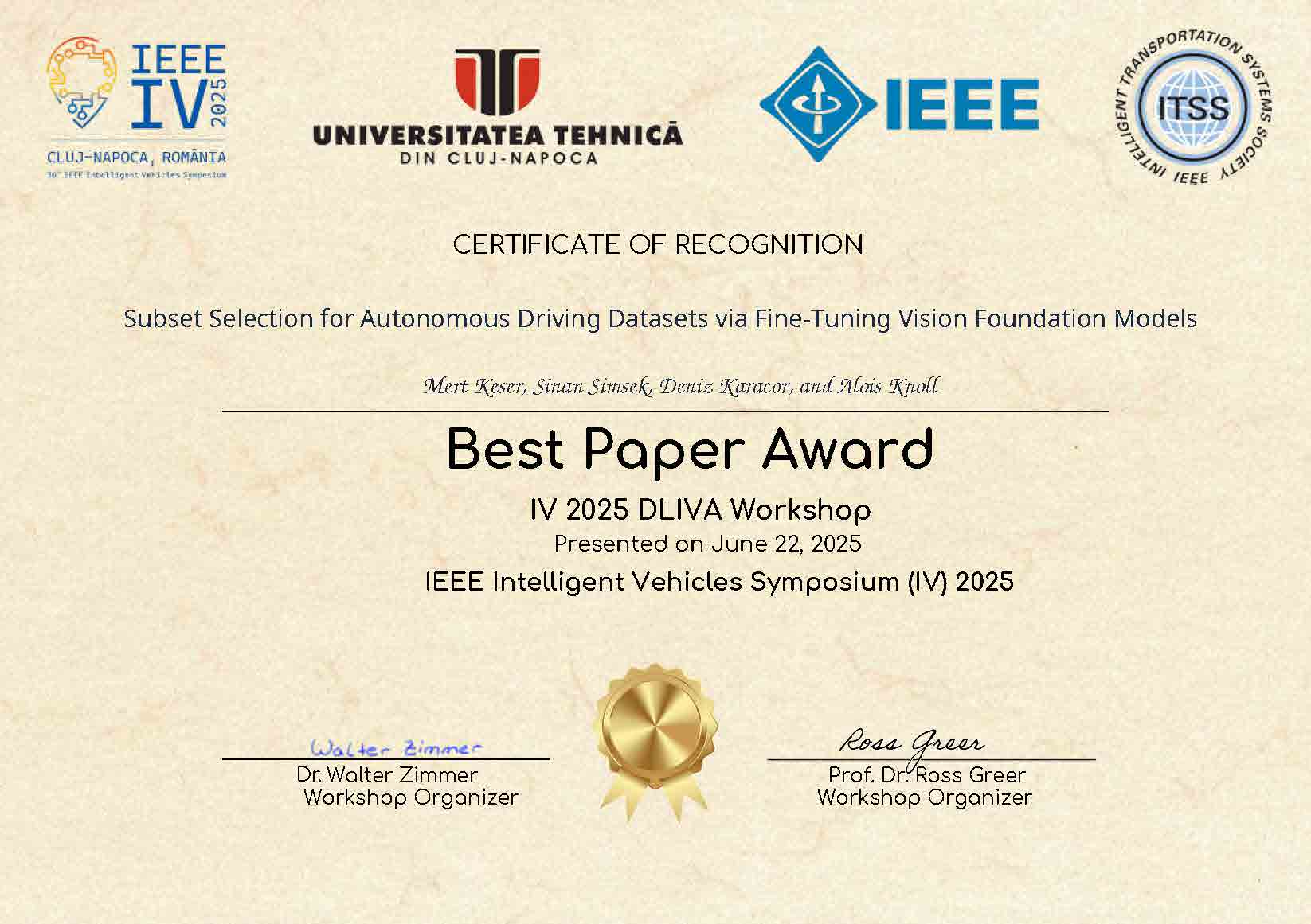 Fakültemiz Elektrik-Elektronik Mühendisliği Bölümü Öğretim Üyesi Dr. Deniz Karaçor, 22-25 Haziran 2025 tarihlerinde Romanya’nın Cluj-Napoca şehrinde düzenlenen ‘IEEE Intelligent Vehicles Symposium (IV) 2025 DLIVA Workshop’ organizasyonunda sunulan ‘Subset Selection for Autonomous Driving Datasets via Fine-Tuning Vision Foundation Models’ başlıklı çalışma ile ‘En İyi Bildiri’ ödülünü almıştır. Hocamızı kutlar başarılarının devamını dileriz.